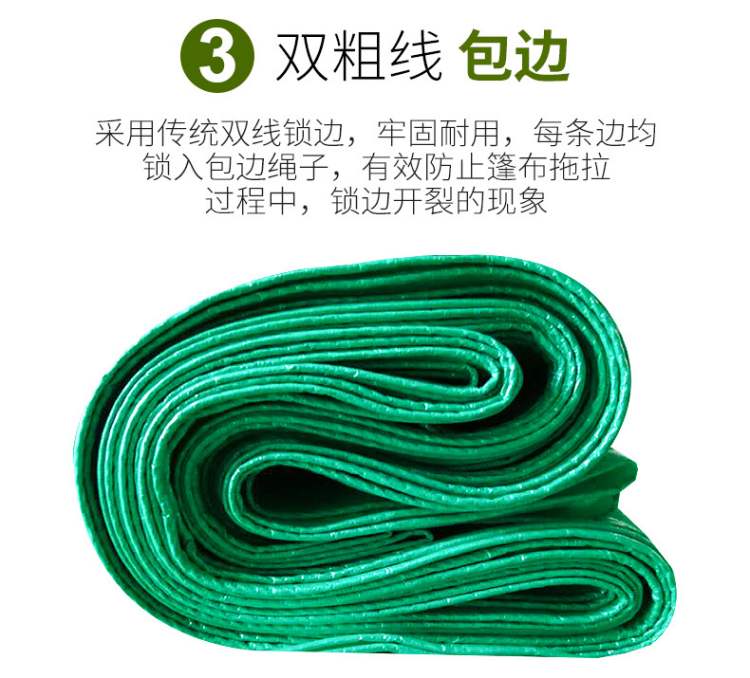 雙綠色PE防水篷布雙粗線包邊,采用傳統雙線鎖邊,牢固耐用,每條邊均鎖入包邊繩子,有效防止篷布拖拉過程中,鎖邊開裂的現象