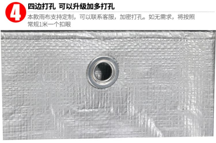 雙銀色PE防水篷布四邊打孔,可以升級(jí)加多打孔,本款雨布支持定制,可以加密打孔,如無(wú)特殊要求,將按照常規(guī)1米一個(gè)扣眼。