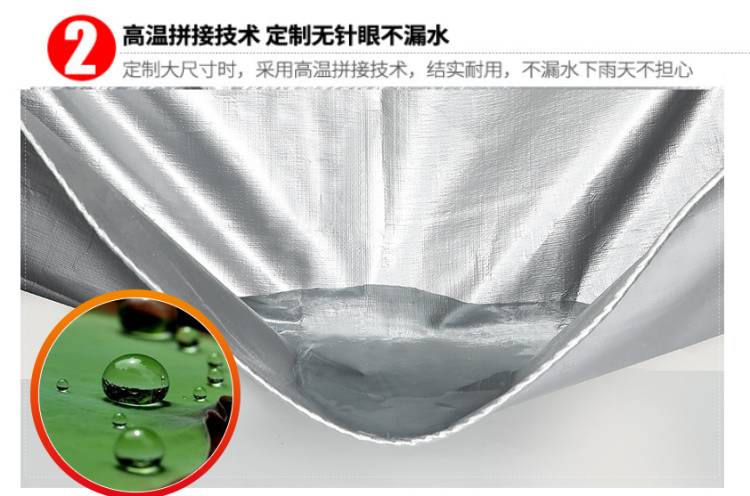 雙銀色PE防水篷布高溫拼接技術(shù),定制無(wú)針眼不漏水,定制大尺寸時(shí),采用高溫拼接技術(shù),結(jié)實(shí)耐用,不漏水下雨天不擔(dān)心。
